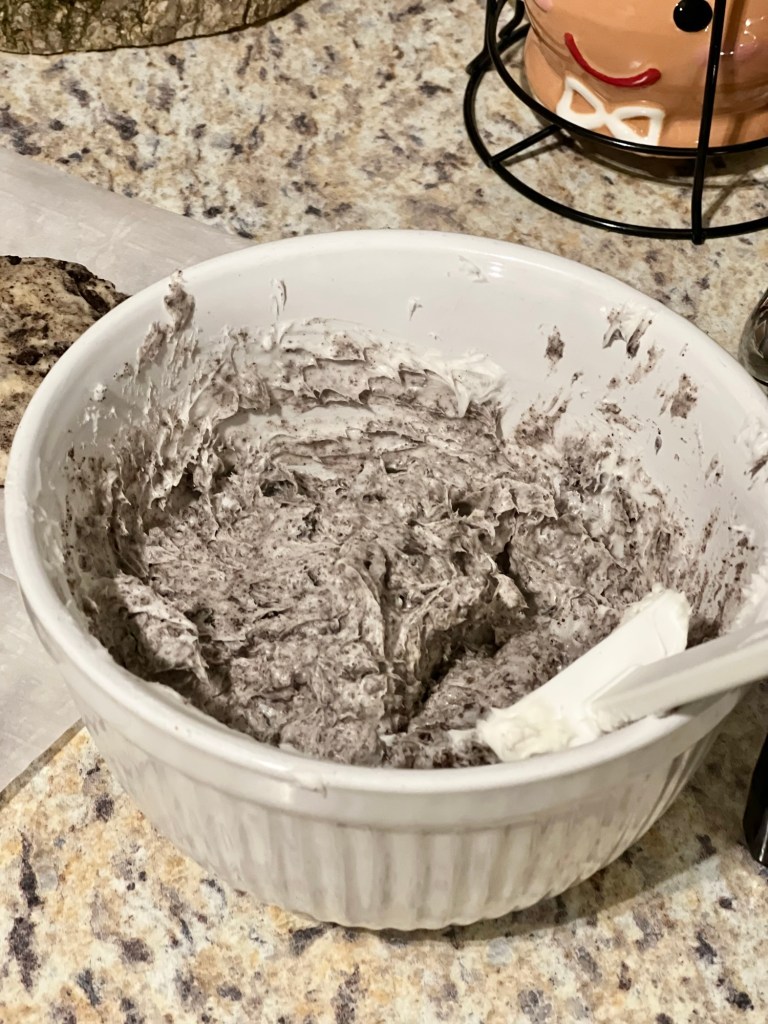 6. For frosting: Transfer Oreo frosting to a bowl and add in crushed Oreos. Stir to combine.